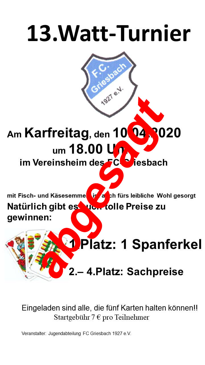 Nach Verlängerung der Ausgangsbeschränkung durch die Bayrische Staatsregierung, bis vorerst 19.04.2020, wird das Wattturnier der Jugendabteilung abgesagt.