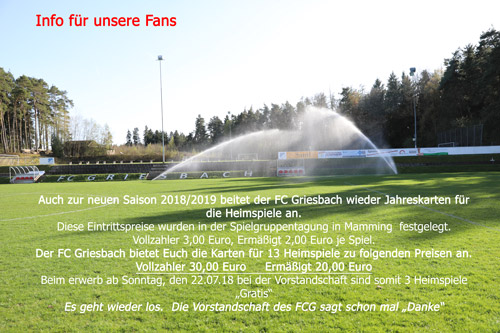 Am 16.06.18 begrüßte Trainer Gerald Eckmeier seine Spieler zur 1. Trainingseinheit auf dem Sportplatz in Griesbach. Seitdem haben die Jungs 18 Einheiten und 5 Spiele absolviert. Mit 2 Siegen, 1 Unentschieden und 2 Niederlagen ist man in der Vereinsführung zufrieden, leider konnte für die Reservemannschaft kein Spiel ausgemacht werden. Auch die Trainingsbeteiligung der „Jungen Wilden“ die aus der A-Jugend zu den Herren aufgerückt sind ist lobenswert. Die Handschrift der A-Jugendtrainer Martin Stock und Robert Moosbauer ist deutlich bei den 8 U19 Spielern aus der Spielgemeinschaft Griesbach/Reisbach/Steinberg zu erkennen und wird dem FCG in den kommenden Jahren von Vorteil sein. Die beiden Rückkehrer David Kammerl und Gregor Kopytowski werden ein fester bestand in den beiden Mannschaften werden und die Verstärkungen Bastian Rähse und Ferdinand Huber werden dringend gebraucht. In den Testspielen in Unteriglbach (6:3,) gegen Türk Gücü Deggendorf (4:2), beim FC Zeholfing (1:6), gegen die DJK Altenkirchen (5:5) und gegen den SSV Eggenfelden (3:6) erzielte die Mannschaft 21 Tore, musste jedoch auch 20 Gegentore hinnehmen. Erfolgreichster Torschütze in der Vorbereitung war Maximilian Huber mit 9 Treffern gefolgt von Alexander Stock (5 Tore), Berkant Üzük (2 Tore) und Sandi Gagula (2 Tore). Am kommenden Freitag, den 20.07.18 ist um 19:00 Uhr das Abschlusstraining zum Saisonstart, ehe es am Sonntag, den 22.07.18 um 13:00 und 15:00 Uhr in Griesbach, gegen den FC Oberpöring, wider um Punkte in der Kreisklasse Dingolfing geht.